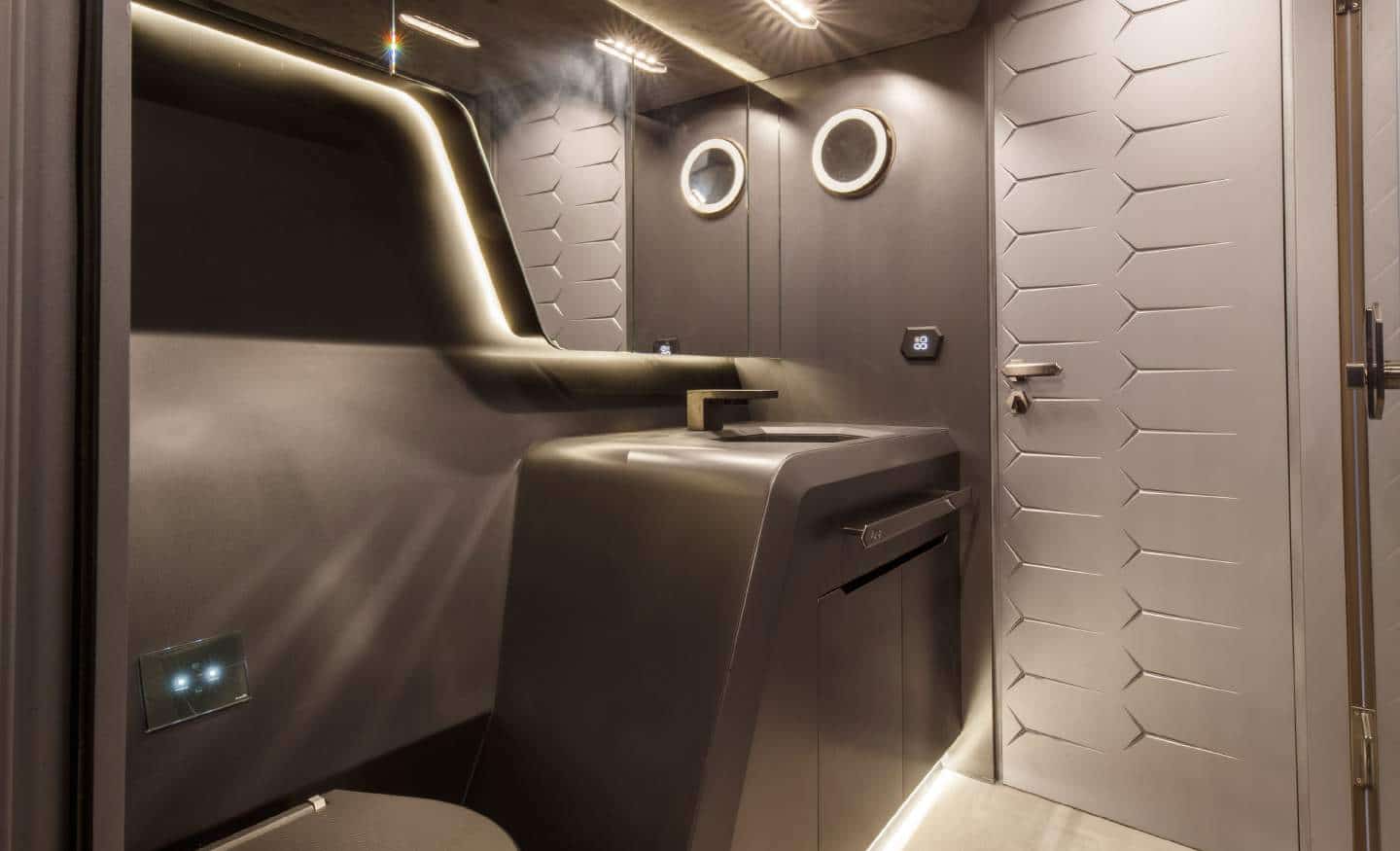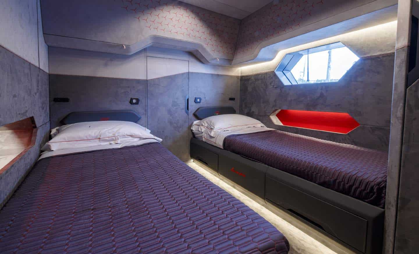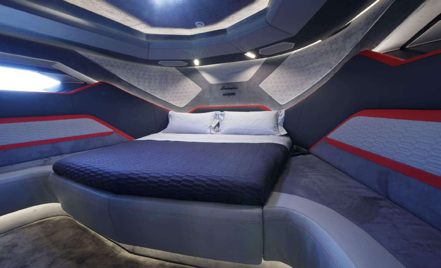 Les deux moteurs MAN V 12 de 2 000 ch permettent au yacht d’atteindre la vitesse impressionnante de 60 nœuds, tandis que l’utilisation de la fibre de carbone (un élément typique des voitures de Sant’Agata Bolognese) lui garantit une classification dans la gamme des bateaux ultralégers, avec un poids maximal de 24 tonnes pour une longueur de 19 mètres.